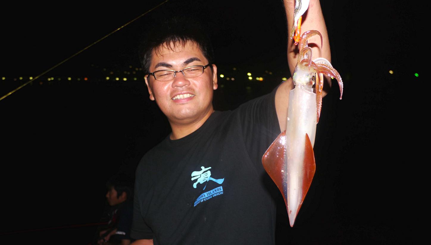 懸念されていたアジゴの猛襲に、夜のシマアジ狙いは露と消え、2時間くらいマキエを打たずに、アジゴの消えるのを待ちます。その間はケンサキイカを狙い、3人で5~6杯の釣果でした。