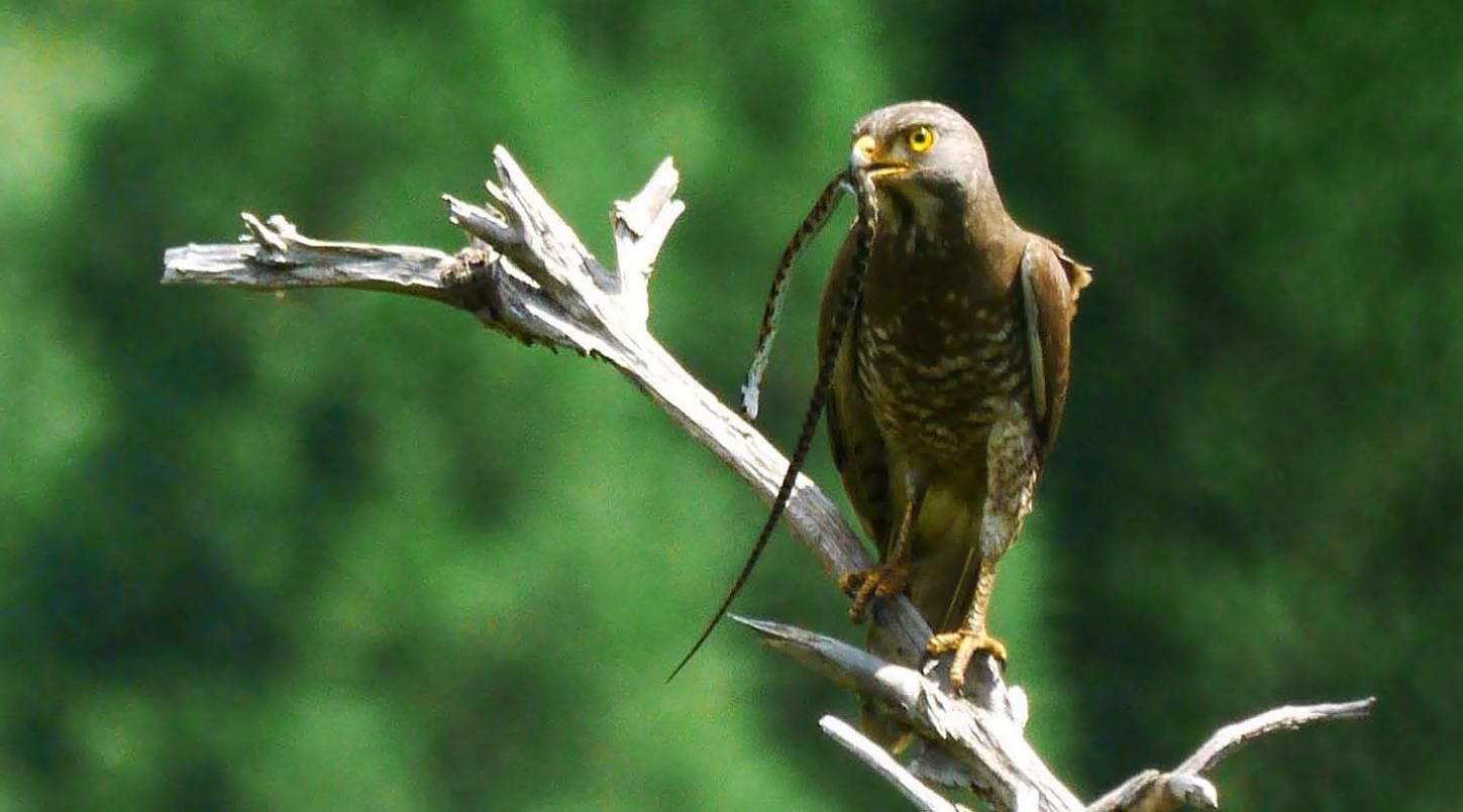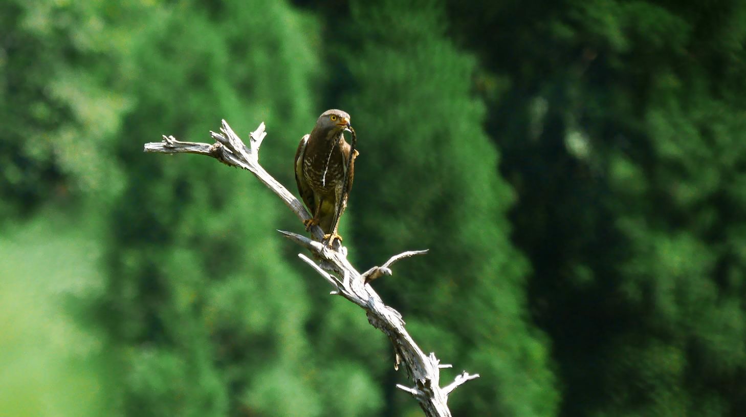 12時過ぎ、枯れ木の見える藪の中から見ていたら、メスが枯れ木に居て、巣の有る方からオスの鳴き声が聞こえていた時、2羽のサシバが仲良く飛んでいました。合計4羽です。雛は今日巣立ったのです。