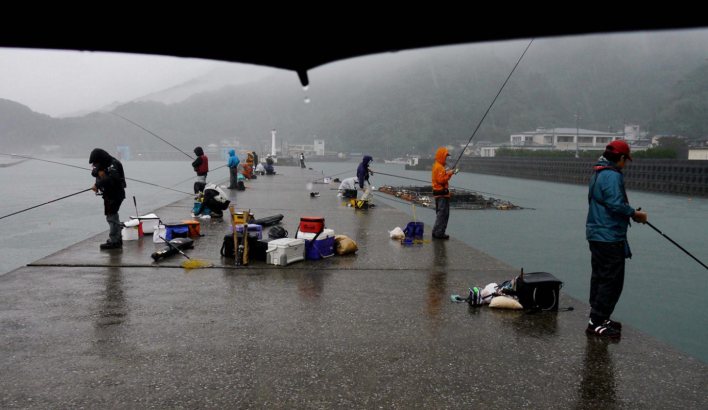 雨天の全体実習は田ノ浦の波止