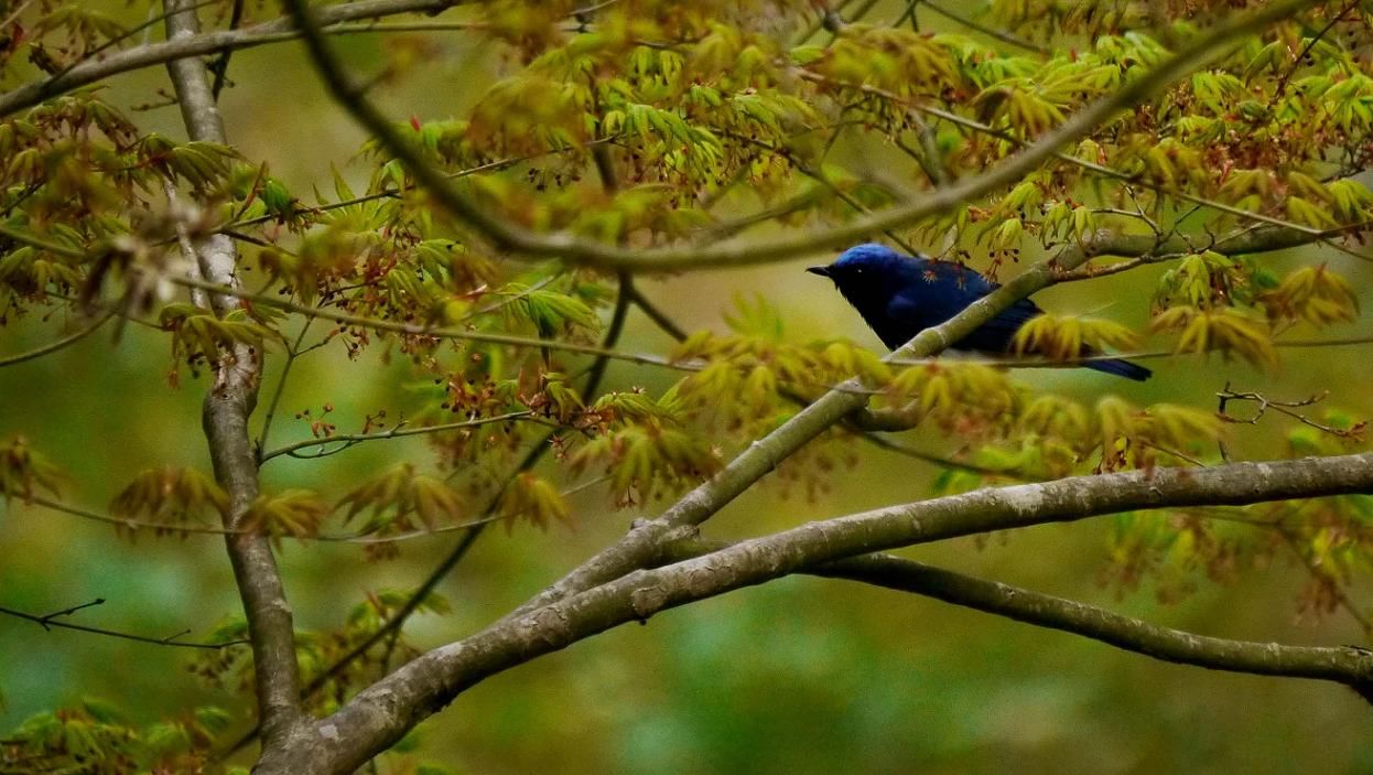 TVの前に車を走らせていると、黒っぽい小鳥の影が目に入りました。直感でオオルリと判断し、車をゆっくり移動させながら目を凝らしていると、綺麗で立派なオスのオオルリがいました。