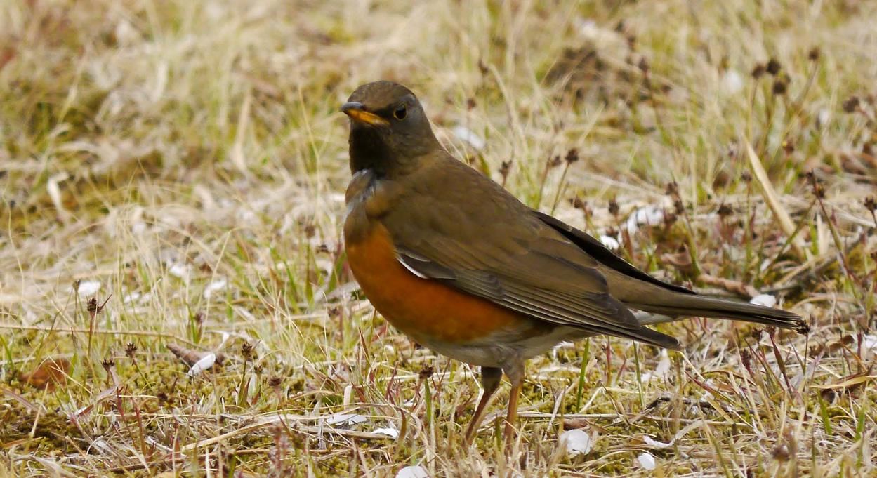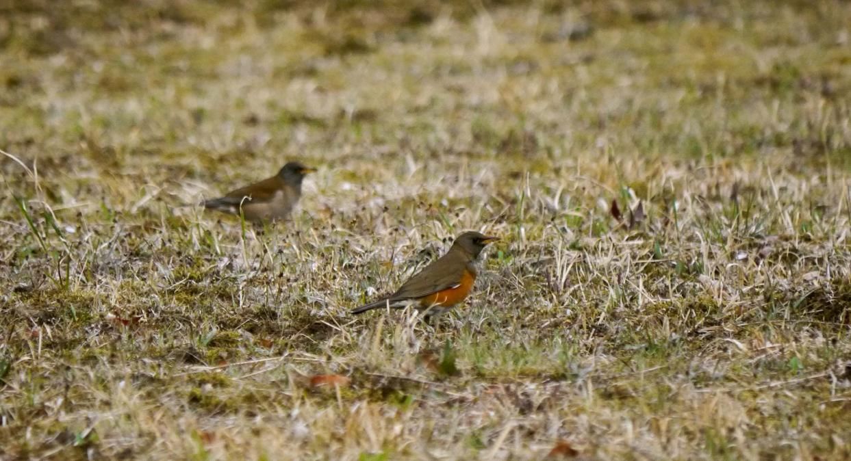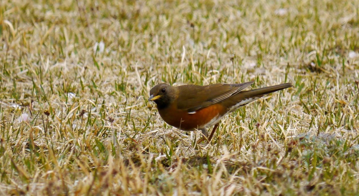 草地でエサを探すアカハラ、来てもらいたい所はタンポポの咲いている場所。でもそこにはホオジロは来てもアカハラは来ません。・・・思惑通りには行きませんね。