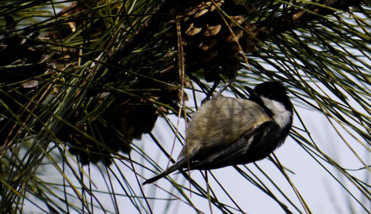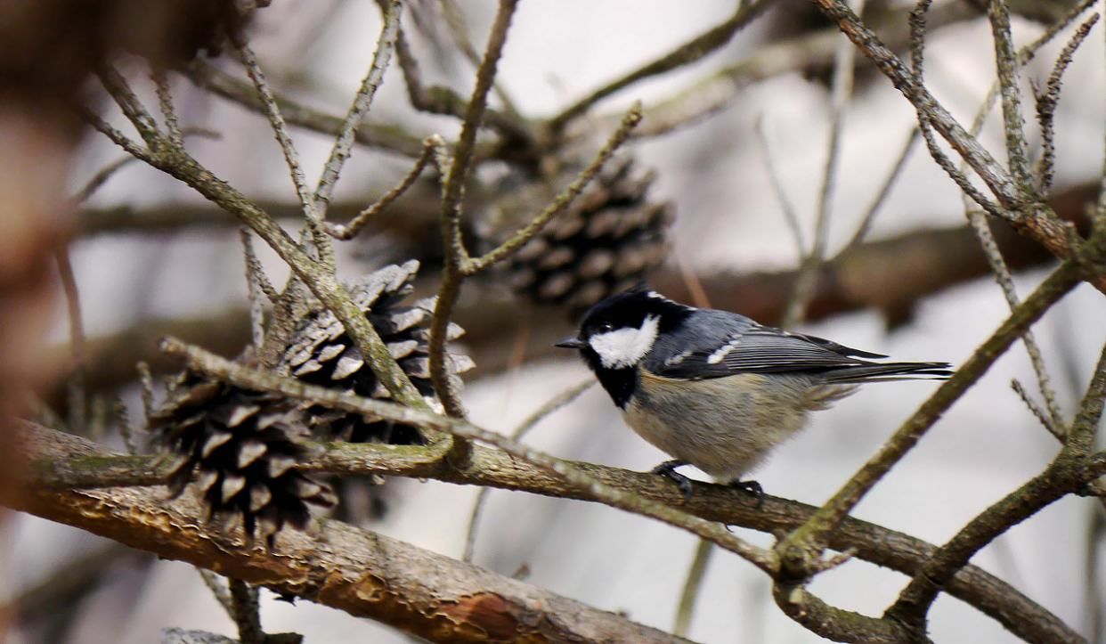 ヒガラは針葉樹などの高い所が好きで、この場所の松の木がお気に入り。昆虫類を食べますが、冬は松の実の種子も好んで啄ばんでいます。