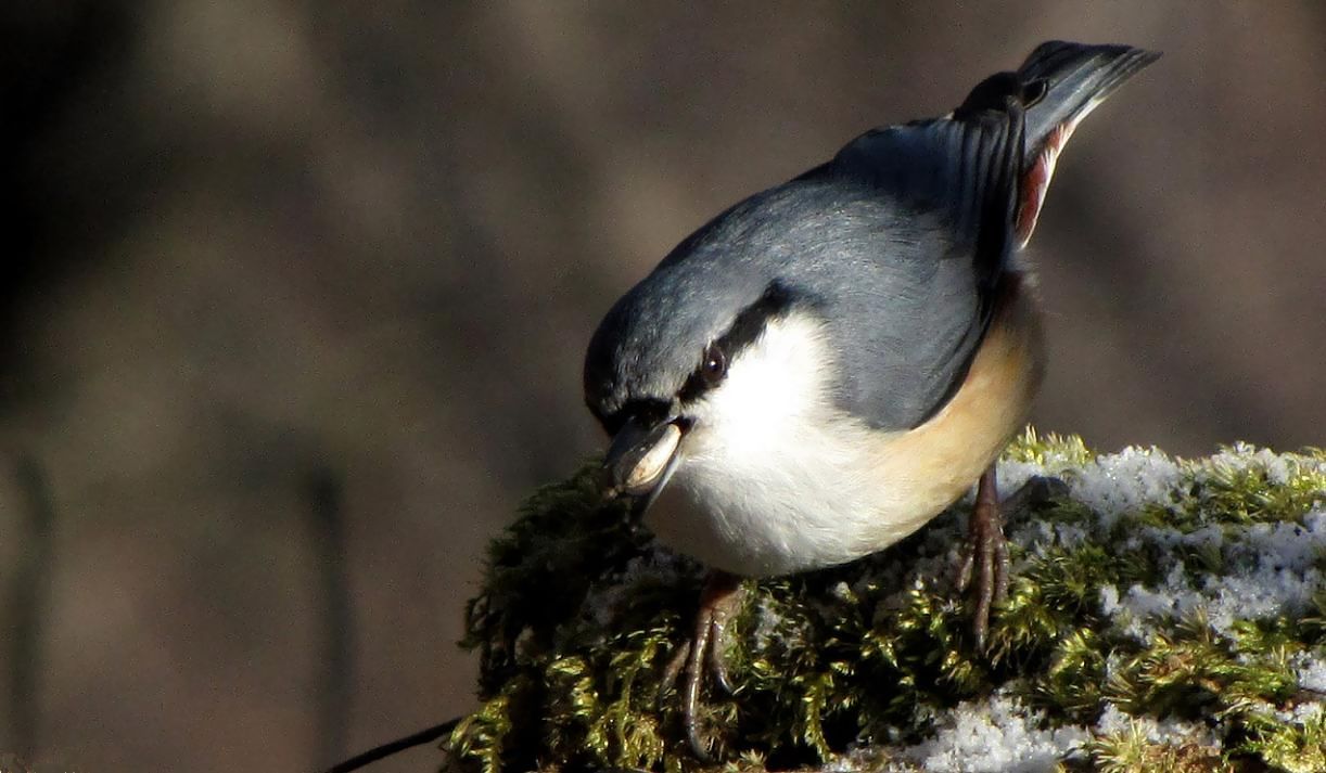 それからのオスのゴジュウカラはほとんど鳴かず、時々餌場に登場しても、本当に警戒心が強く素早く動き回っていました。そんな彼でしたが、今日はかなり遠くでゴジュウカラの声、呼応する様に彼も時々鳴き声をあげていると、遠くのゴジュウカラが次第に近づいて来ました。