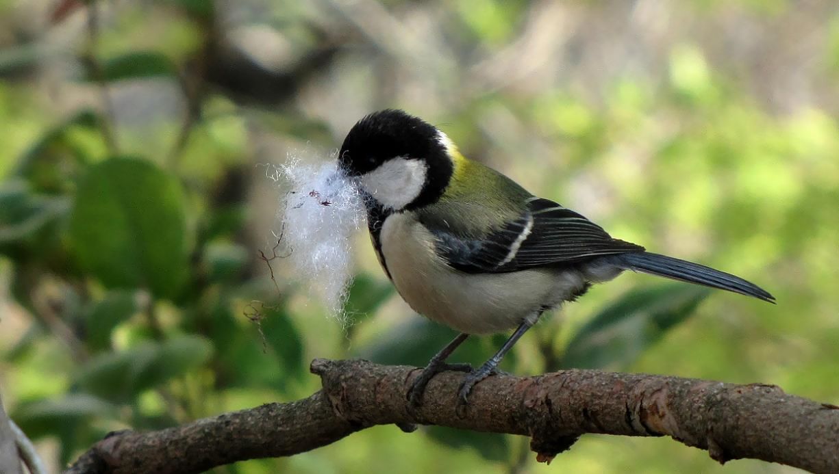 このスポットには、3~4日前から巣剤をプレゼントしています。手芸やぬいぐるみに使う、目の細かい綿をちぎって置いていました。それを、シジュウカラのメスが束ねて持ち去りはじめました。