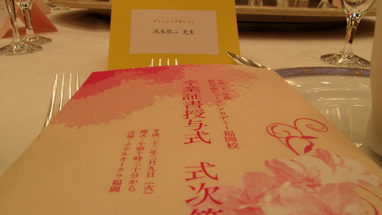 ホテルオークラ博多で、ヒューマンアカデミー福岡校の卒業式が挙行されました。2年間の教育課程を終えた学生は220名くらい?その内フィッシングカレッジの学生は15名。