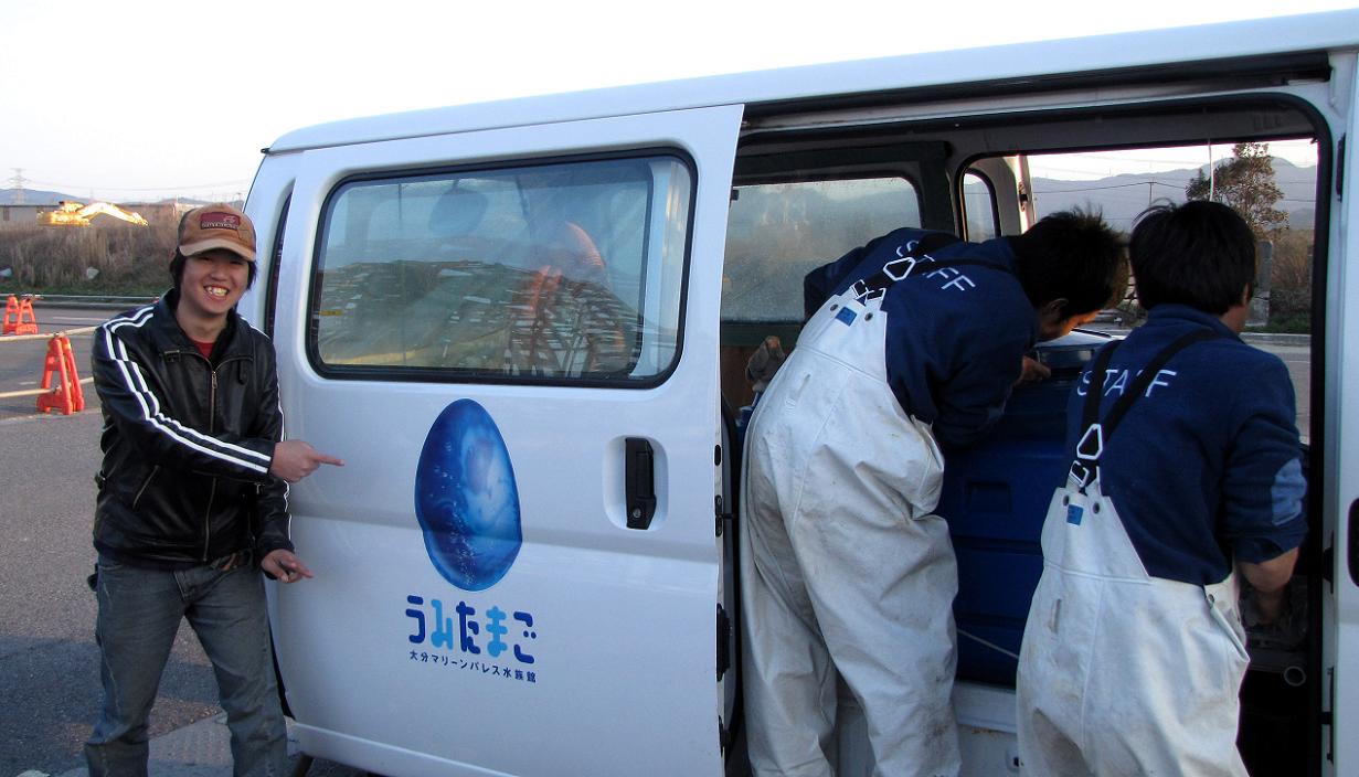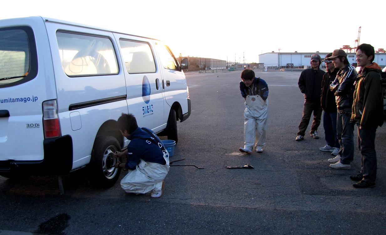とりあえずカンダイを水槽に入れ、それからはパンク修理。でも流石に海水を取り扱う車です。肝心のジャッキは錆付いて使い物になりません。私のジャッキを貸して、無事にカンダイはうたまごに到着した様です。