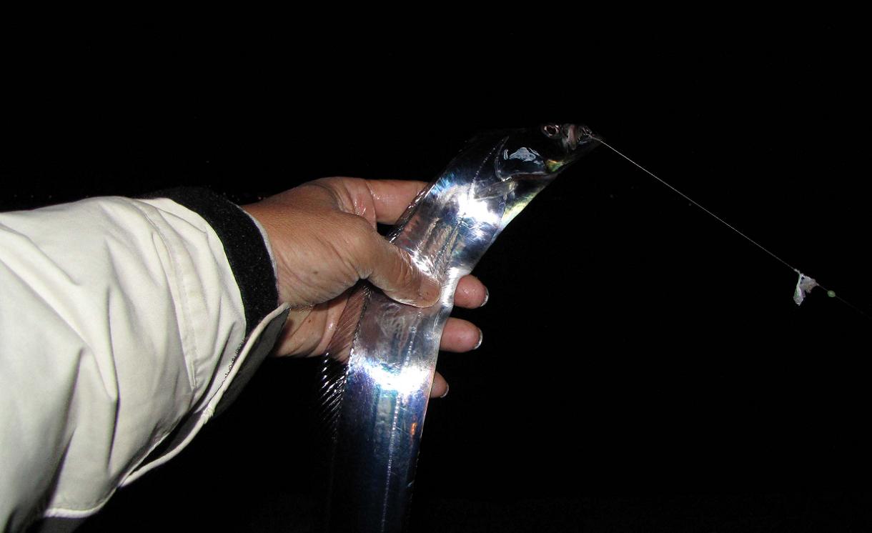 タチウオ釣りにナイフ・まな板・投光機は欠かせません。