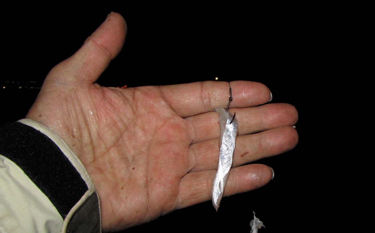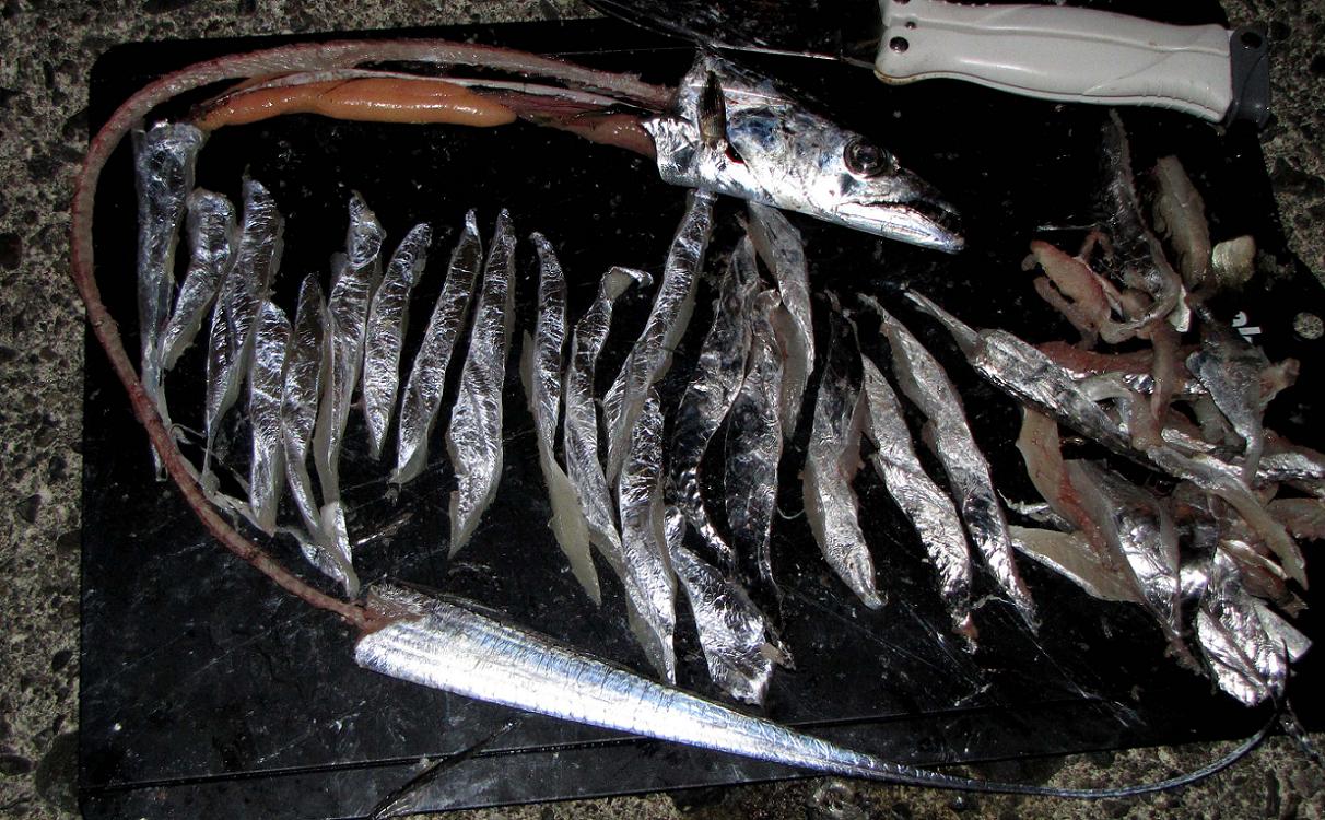 タチウオ釣りの代表的なエサはキビナゴですが、釣れたタチウオの切り身を使うのも良い方法で、タチウオが釣れたらエサには不自由しません。