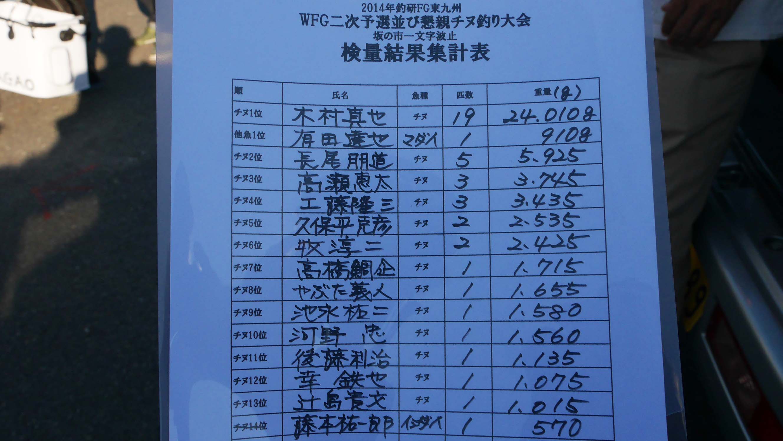 17名が釣ったチヌの合計は23枚、木村君一人が釣ったチヌは19枚!