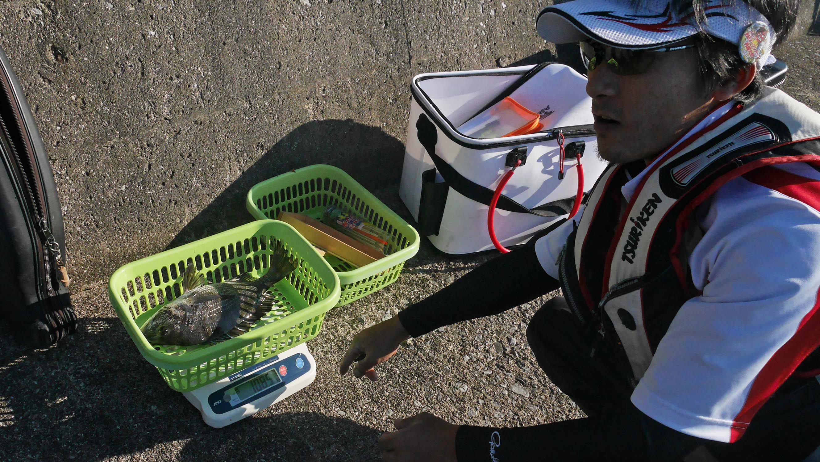 今回の大会はチヌの総重量を競うもので、横一文字の中央付近が会場になりました。検量は釣り場で行ってその後はリリースが基本。他魚での釣果で予選突破を狙っていたのですが、青物は回遊しておらず、マダイ狙いで9時30頃から釣り始めたものの、10時を回ると北東の風に遠投を封じ込まれ一時間でリタイヤ。