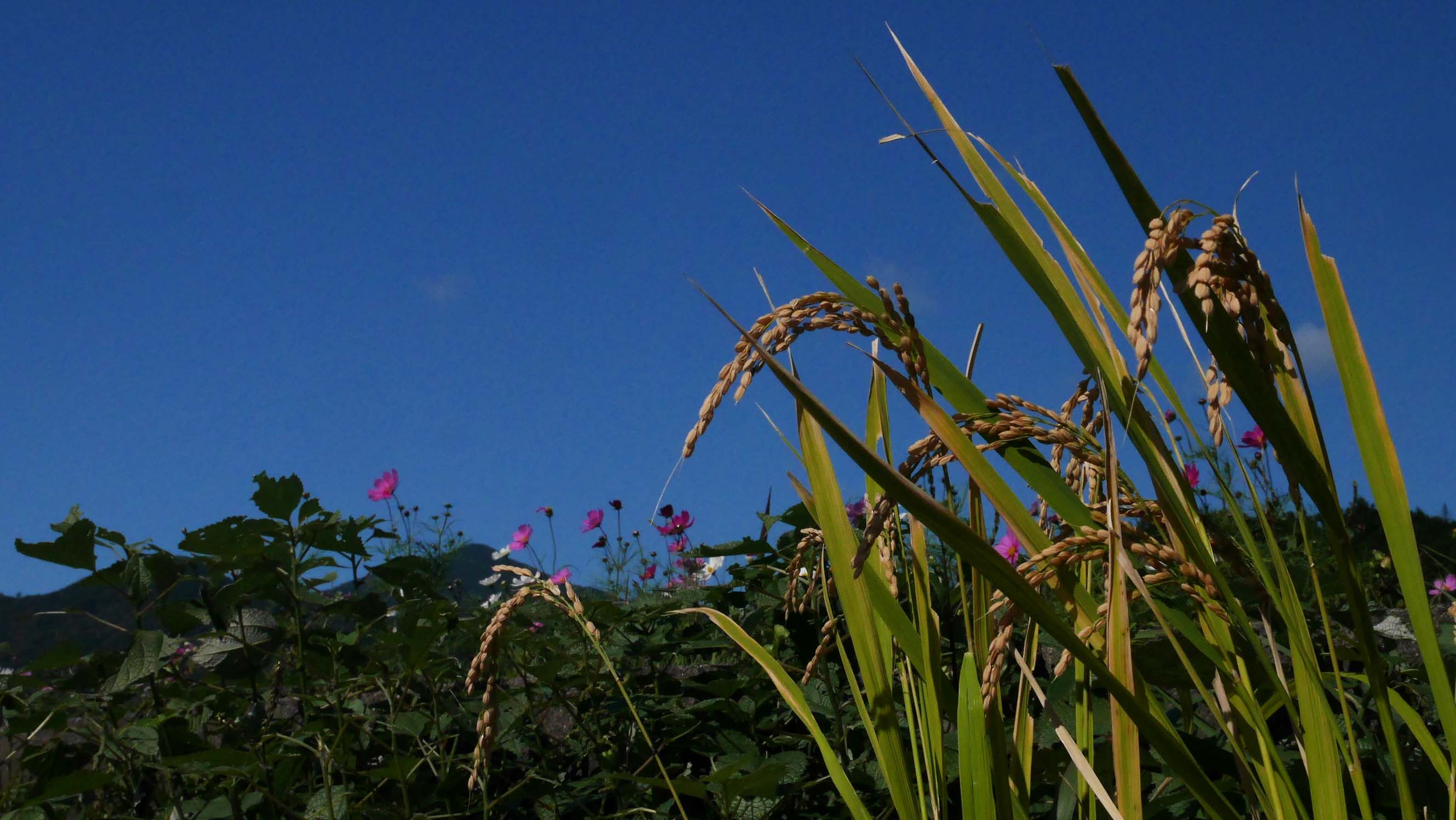 由布市の刈り残りの稲と秋桜