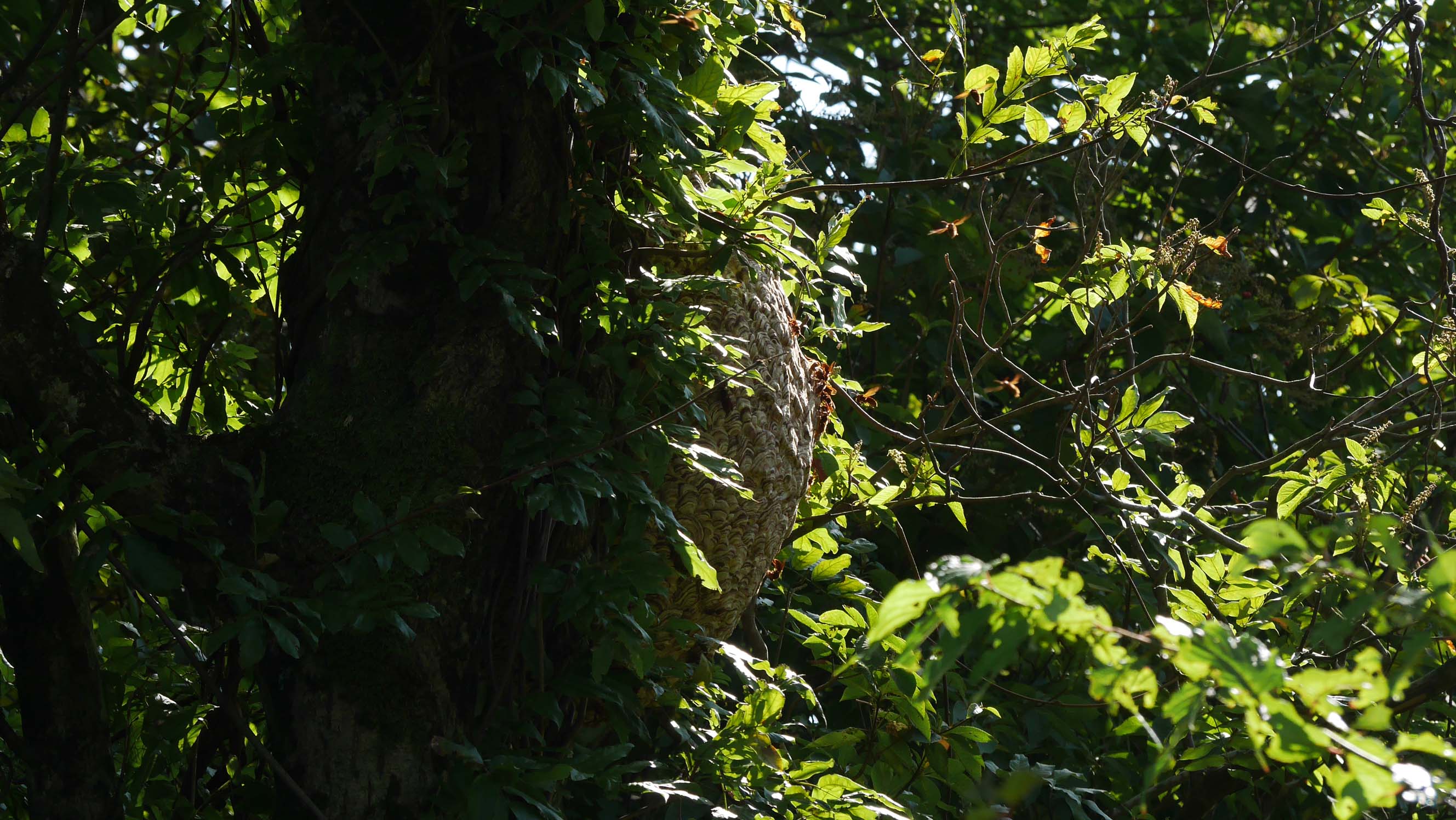 きょろきよろすると、直ぐ横の木の幹に大きな巣がありました。