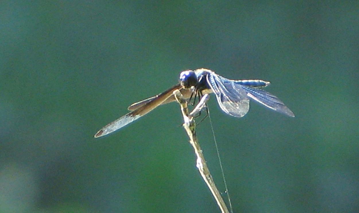 その中で、一番遅くに現れたのがチョウトンボです。ホテイアオイの花が咲き揃って、お日様が水面を照らし始める8時頃、ようやく飛びはじめました。水面上でホバーリングしたり、枝に止まって休んだり・・・
