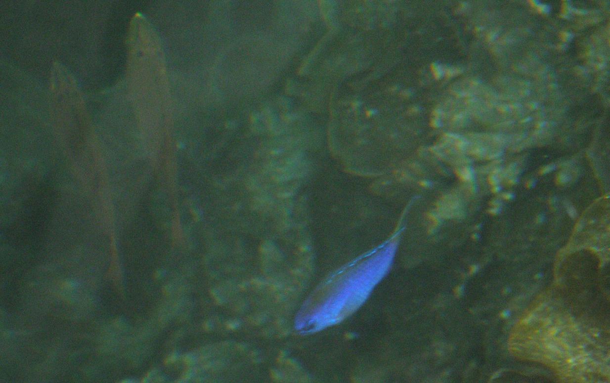 ソラスズメダイに似ているのがルリスズメダイで、二つのお魚を混同してコバルトスズメと言ったり、かなりややこしい。コバルトスズメという標準和名は、ルリスズメのメスを別種と間違えて付けられた名前だけど、今は統一されています。