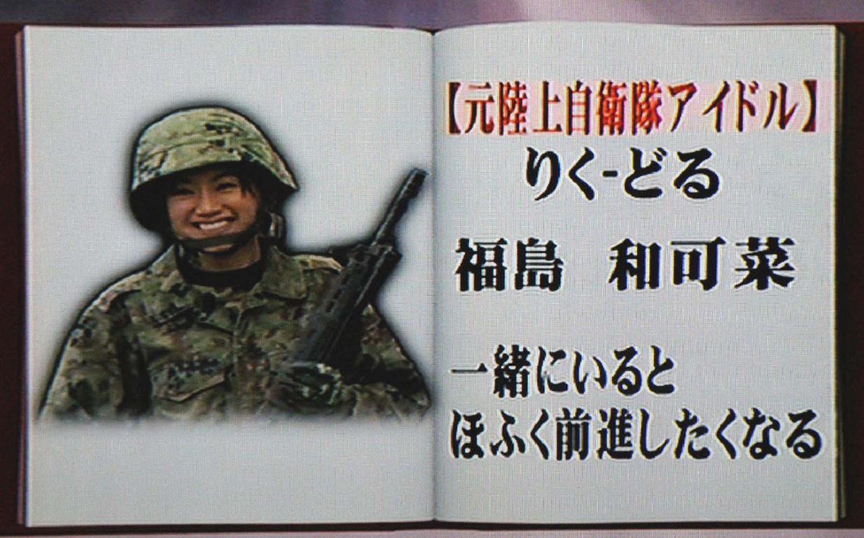 ブログでは、ほぼ毎日彼女を拝見させて頂いていますが、田舎の大分で初めてTVの和可菜ちゃんを拝見しました。なにやらバラエティ番組の様で、自衛隊の体験入隊を放送しているのす。