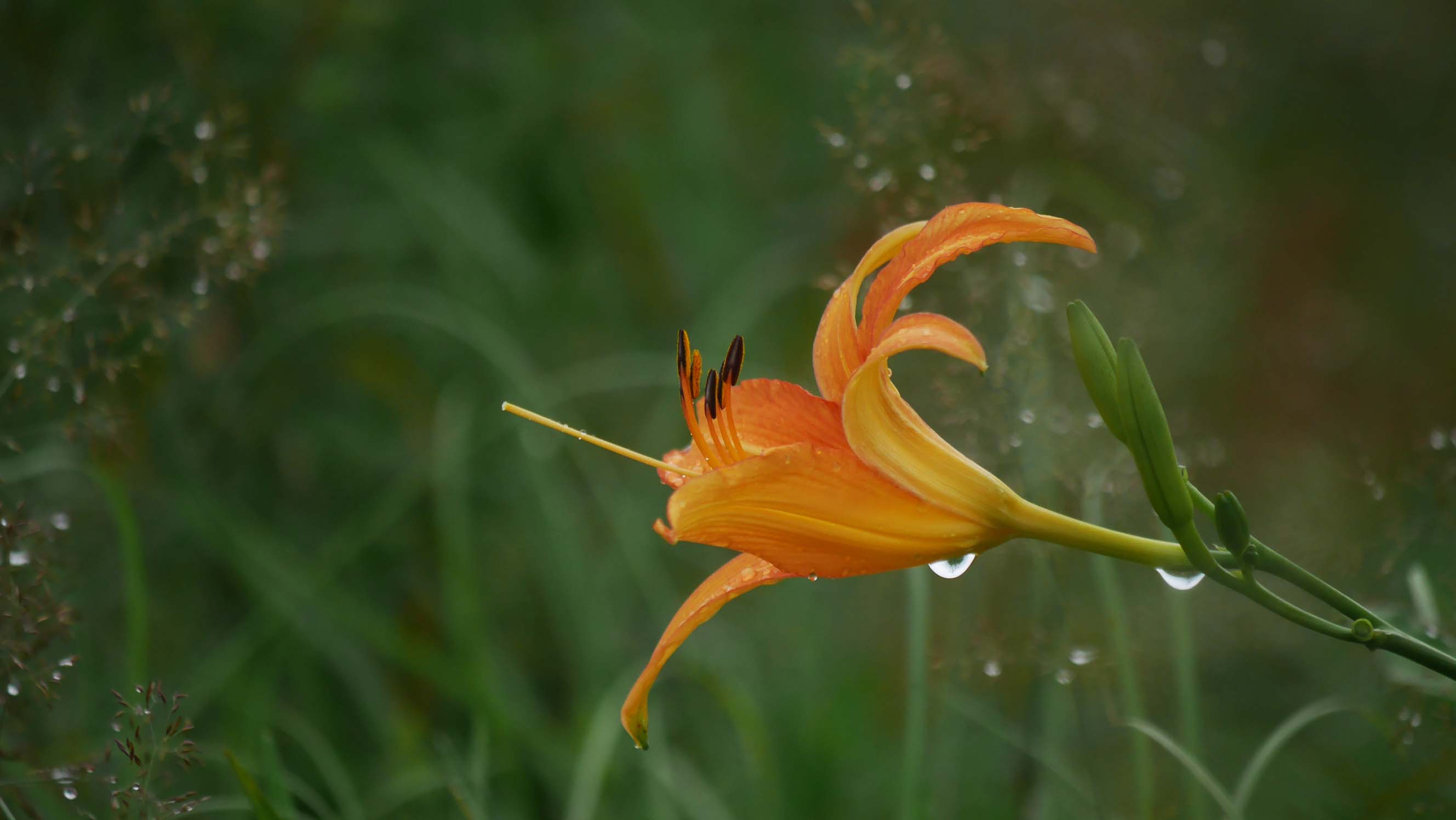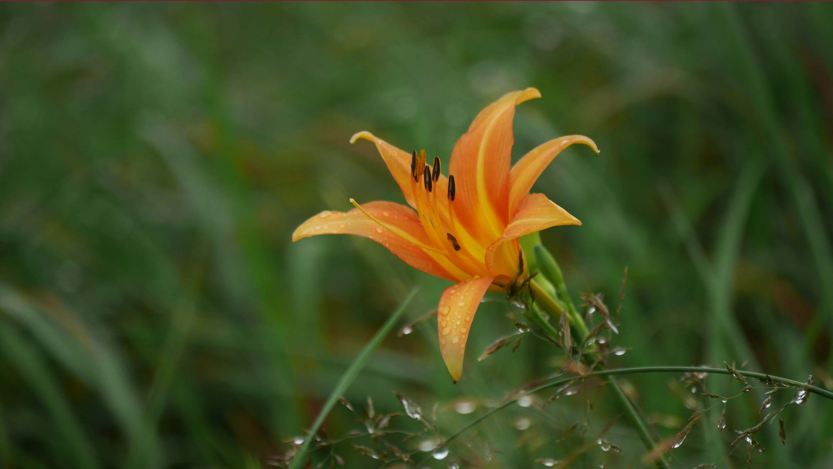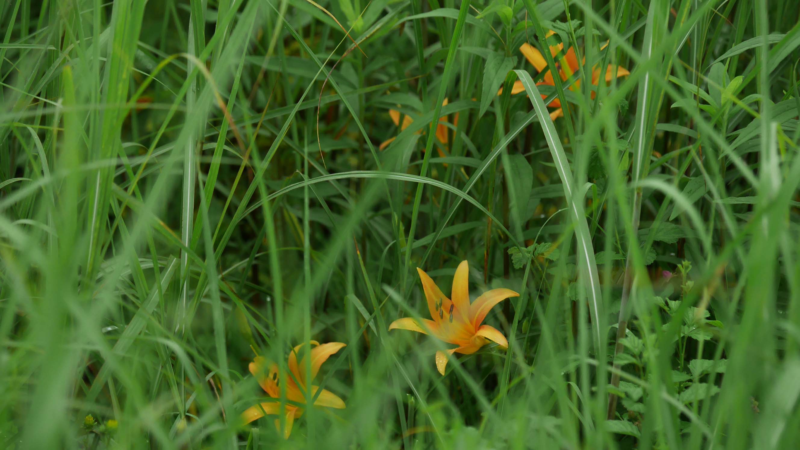 草原の片隅には人の通った跡があり、それを突き進むとオレンジ色の花が点在。