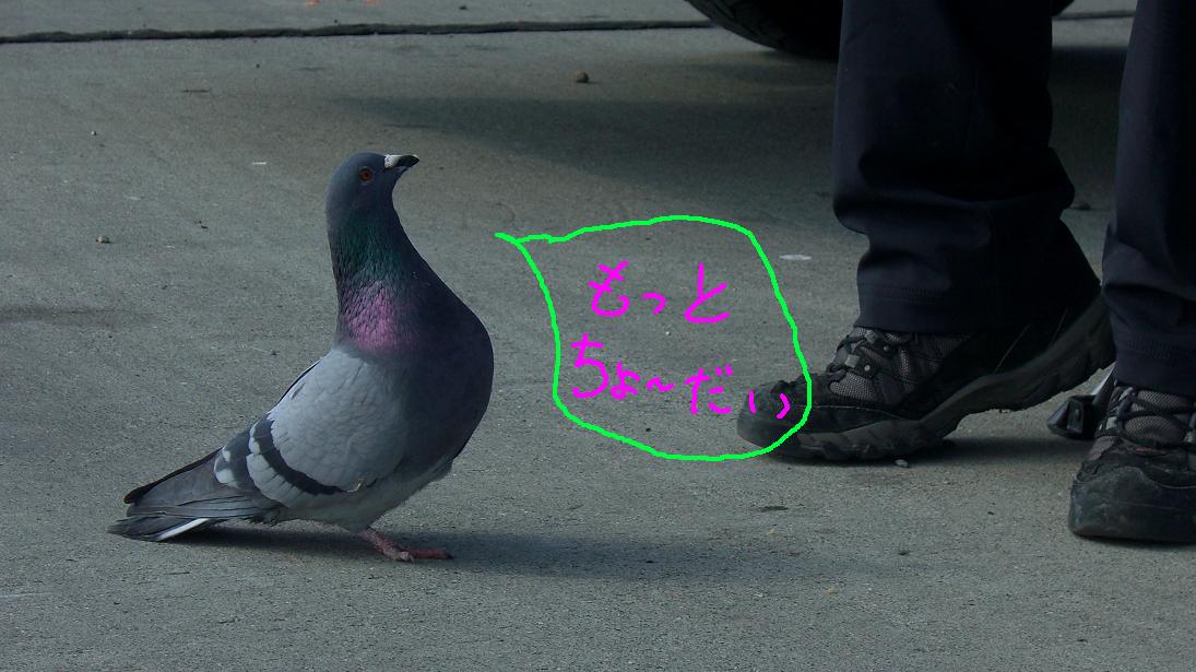 おねだりするハトだけど、もうおでんはない。あとで2kg入りの押しムギをあげたら、見る見るうちにハトが増えた。