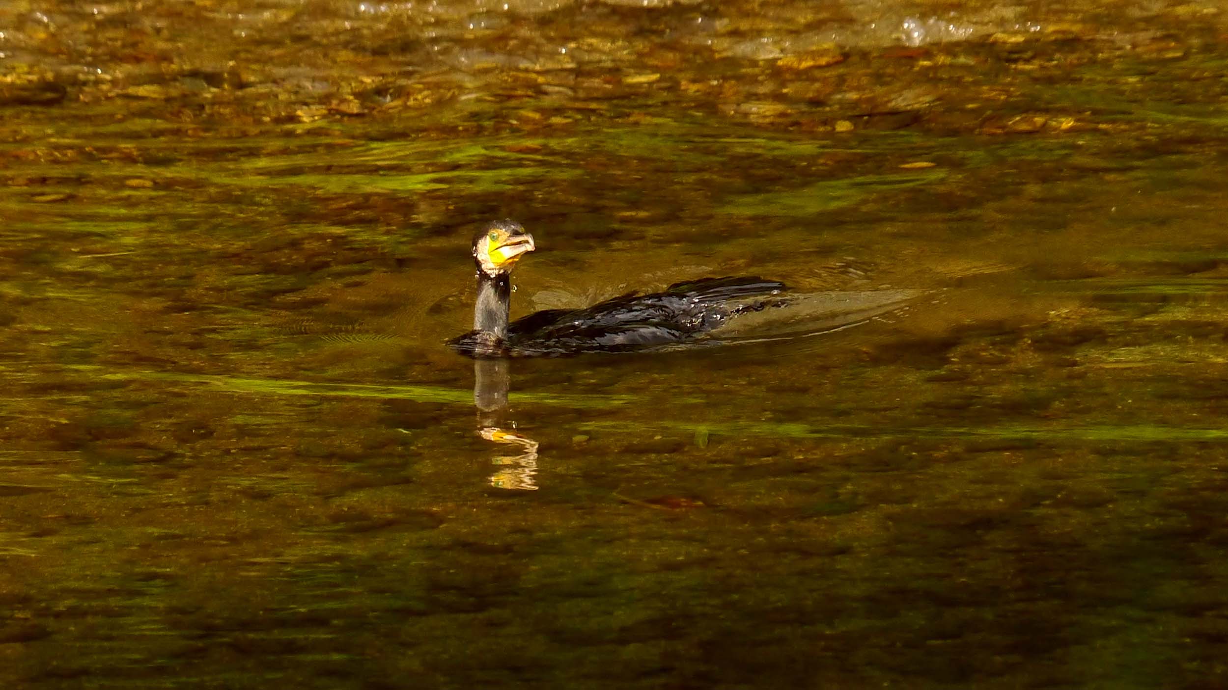 アユを狙う鳥は沢山居て、アオサギ・ヤマセミ・ミサゴなどが、この界隈で狩りを繰り返しています。今日は一羽のカワウが群れアユを追って潜っていましたが、アユたちは一羽のカワウを翻弄していました。