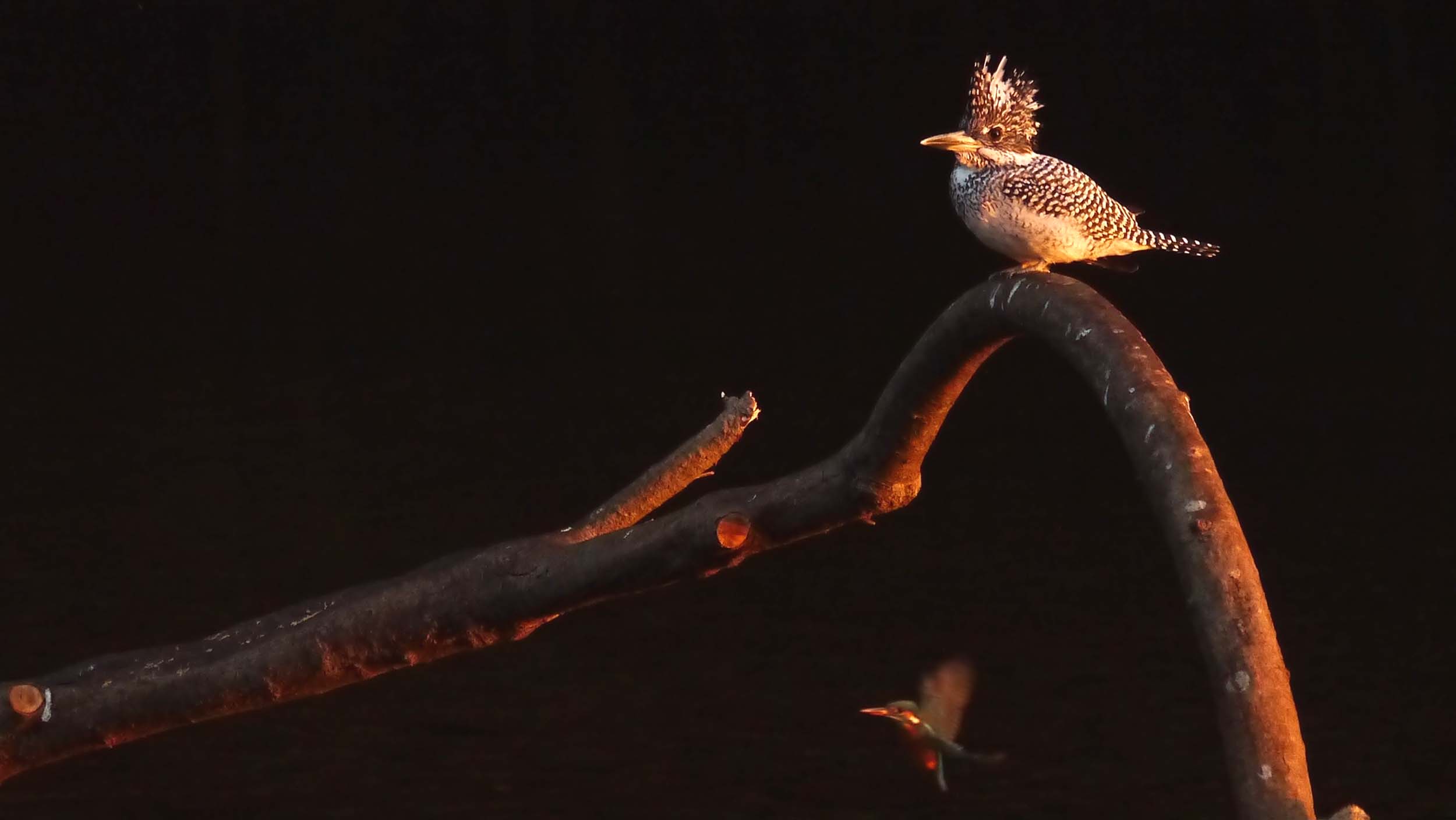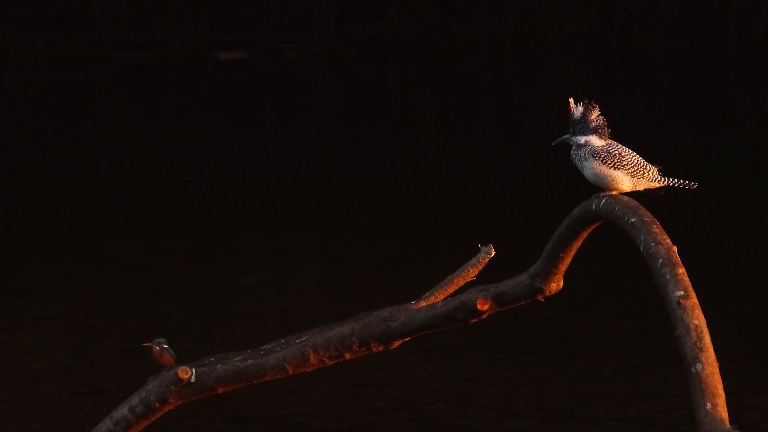 メスのヤマセミの元へ、メスのカワセミが飛来